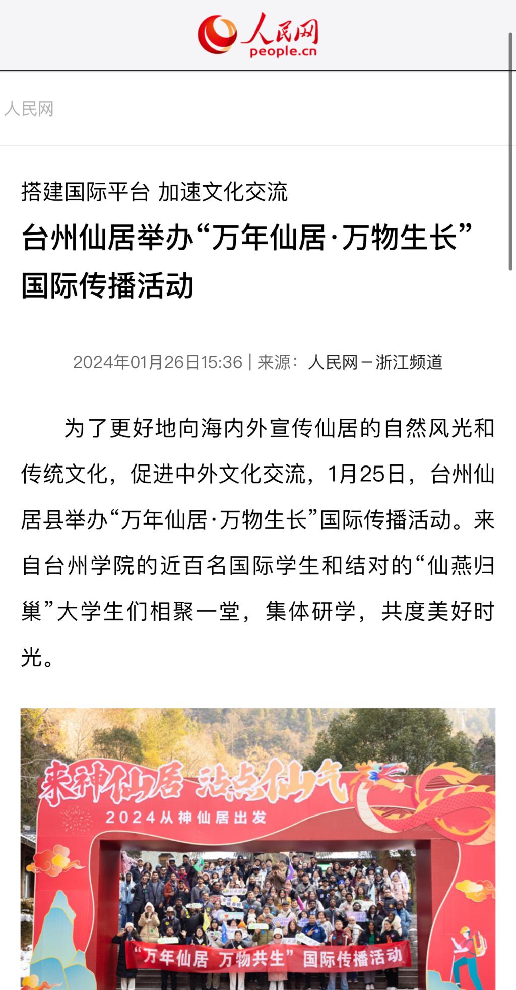 为了更好地向海内外宣传仙居的自然风光和传统文化,促进中外文化交流,1月25日,台州仙居县举办“万年仙居·万物生长”国际传播活动。来自台州学院的近百名国际学生和结对的“仙燕归巢”大学生们相聚一堂,集体研学,共度美好时光。