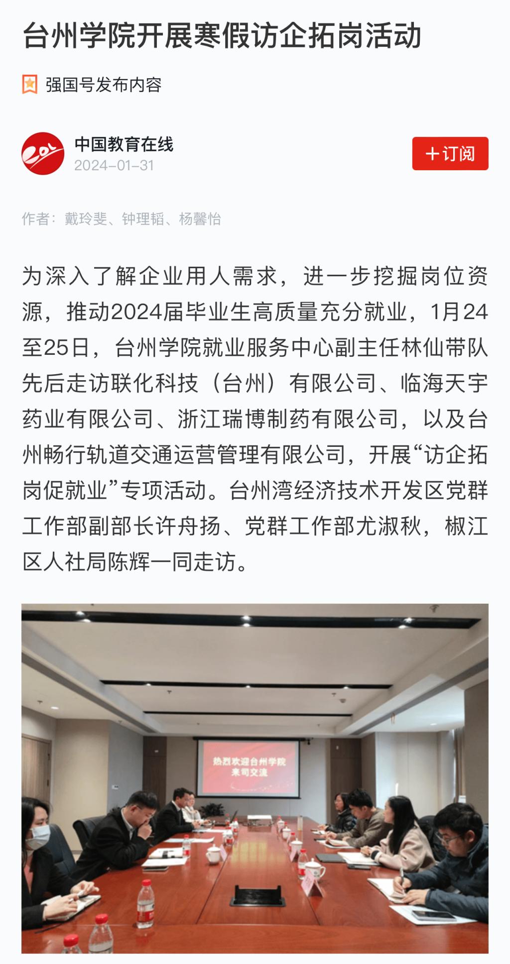 为深入了解企业用人需求,进一步挖掘岗位资源,推动2024届毕业生高质量充分就业,1月24至25日,台州学院就业服务中心副主任林仙带队先后走访联化科技(台州)有限公司、临海天宇药业有限公司、浙江瑞博制药有限公司,以及台州畅行轨道交通运营管理有限公司,开展“访企拓岗促就业”专项活动。台州湾经济技术开发区党群工作部副部长许舟扬、党群工作部尤淑秋,椒江区人社局陈辉一同走访。