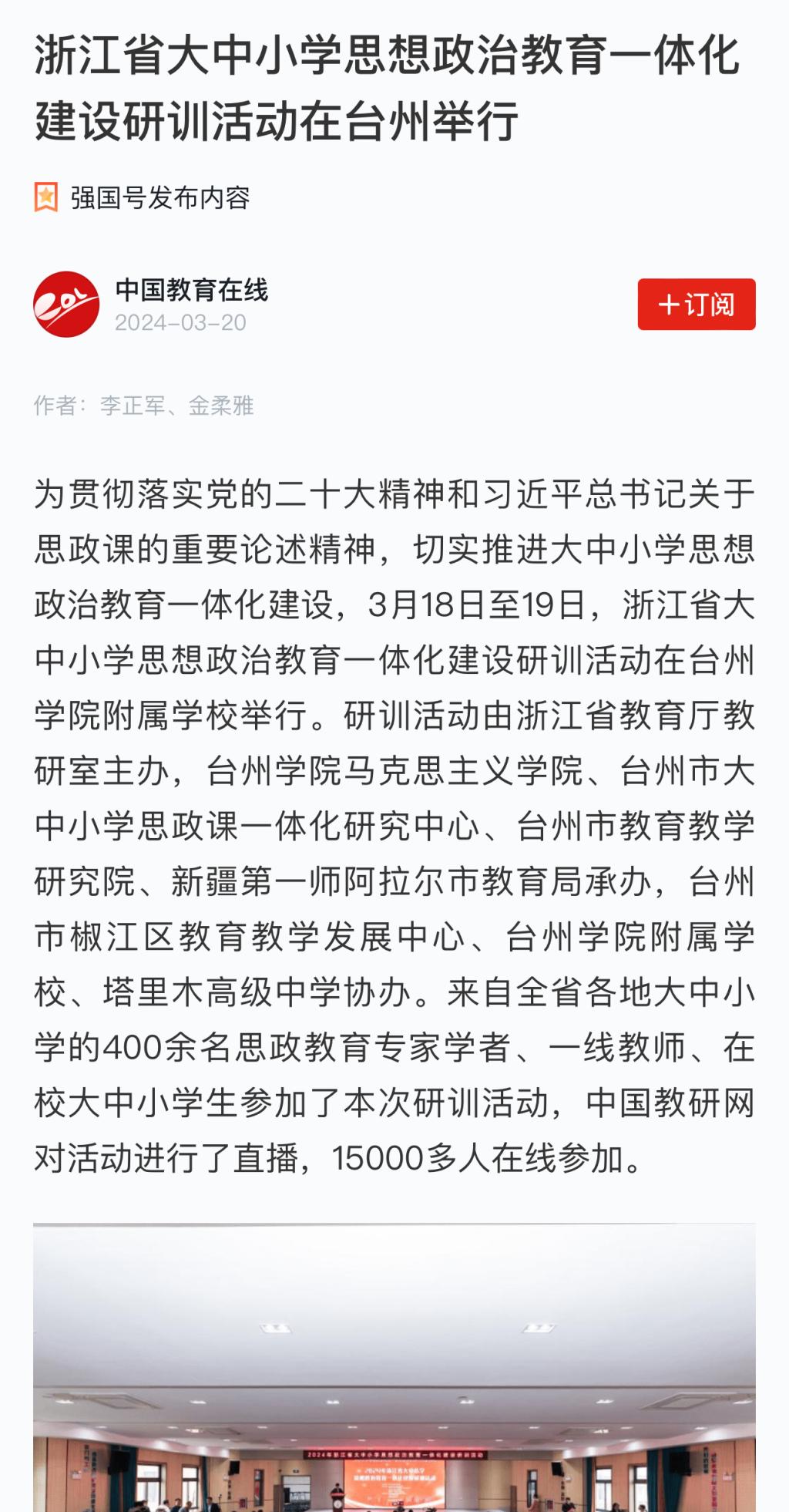 为贯彻落实党的二十大精神和习近平总书记关于思政课的重要论述精神,切实推进大中小学思想政治教育一体化建设,3月18日至19日,浙江省大中小学思想政治教育一体化建设研训活动在台州学院附属学校举行。研训活动由浙江省教育厅教研室主办,台州学院马克思主义学院、台州市大中小学思政课一体化研究中心、台州市教育教学研究院、新疆第一师阿拉尔市教育局承办,台州市椒江区教育教学发展中心、台州学院附属学校、塔里木高级中学协办。来自全省各地大中小学的400余名思政教育专家学者、一线教师、在校大中小学生参加了本次研训活动,中国教研网对活动进行了直播,15000多人在线参加。
