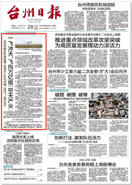 随着商业航天、低空经济被写入今年的政府工作报告,并作为“新增长引擎”,台州的“天空之城”在逐梦蓝天过程中迈出了重要一步,正“飞”向万亿级风口。