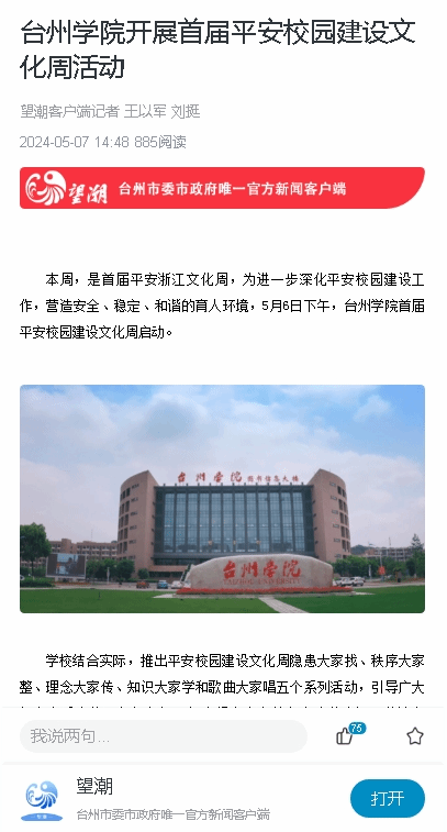 本周,是首届平安浙江文化周,为进一步深化平安校园建设工作,营造安全、稳定、和谐的育人环境,5月6日下午,台州学院首届平安校园建设文化周启动。