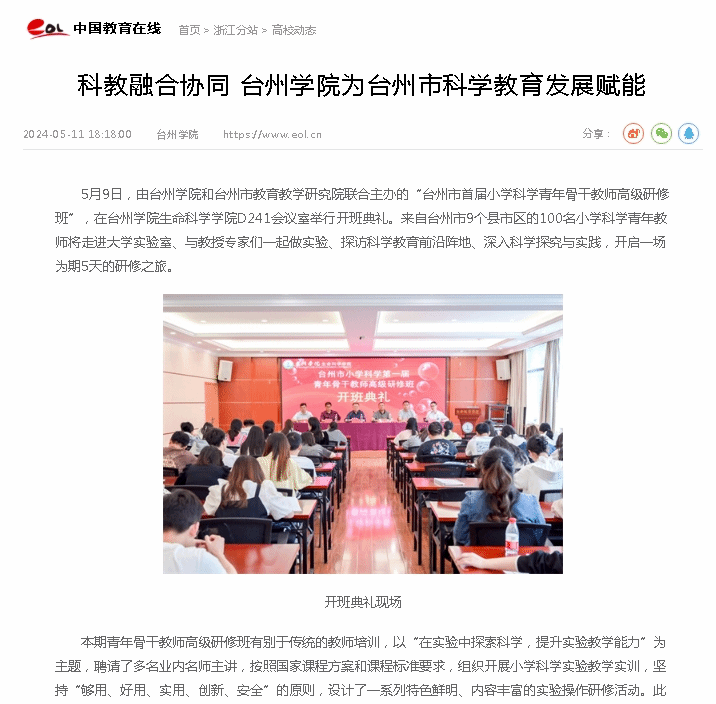 “此次的培训内容既遵照国家课标培训学员规范科学实验教学流程,又将高端科研资源与科学教育培训相结合,让科学教师了解前沿学科发展动态,加强科学教育实践能力,转变科学教育观念,提升自身科学素养以反哺科学教育,从而培养科技创新人才。”台州学院生命科学学院院长赵凯教授说。