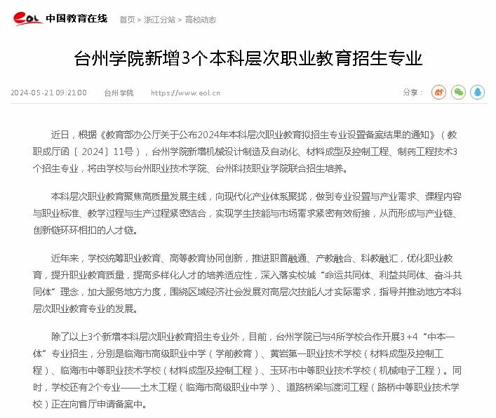 近日,根据《教育部办公厅关于公布2024年本科层次职业教育拟招生专业设置备案结果的通知》(教职成厅函〔 2024〕11号),台州学院新增机械设计制造及自动化、材料成型及控制工程、制药工程技术3个招生专业,将由学校与台州职业技术学院、台州科技职业学院联合招生培养。