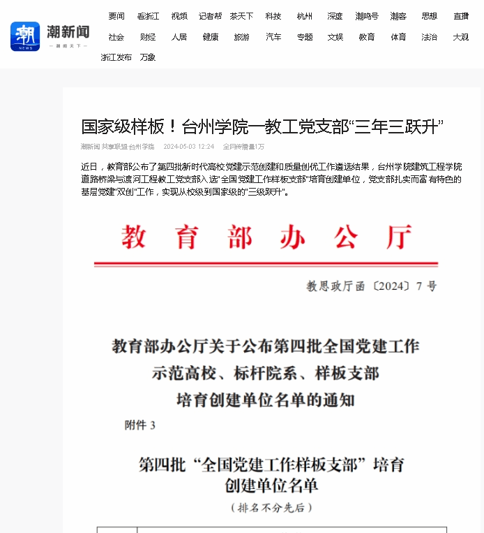 近日,教育部公布了第四批新时代高校党建示范创建和质量创优工作遴选结果,台州学院建筑工程学院道路桥梁与渡河工程教工党支部入选“全国党建工作样板支部”培育创建单位,党支部扎实而富有特色的基层党建“双创”工作,实现从校级到国家级的“三级跃升”。