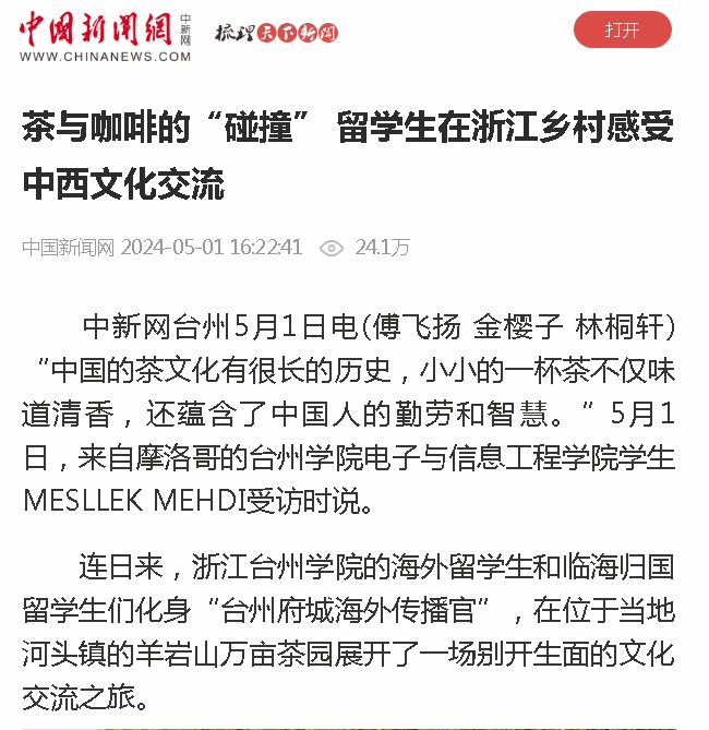 “中国的茶文化有很长的历史,小小的一杯茶不仅味道清香,还蕴含了中国人的勤劳和智慧。”5月1日,来自摩洛哥的台州学院电子与信息工程学院学生MESLLEK MEHDI受访时说。
