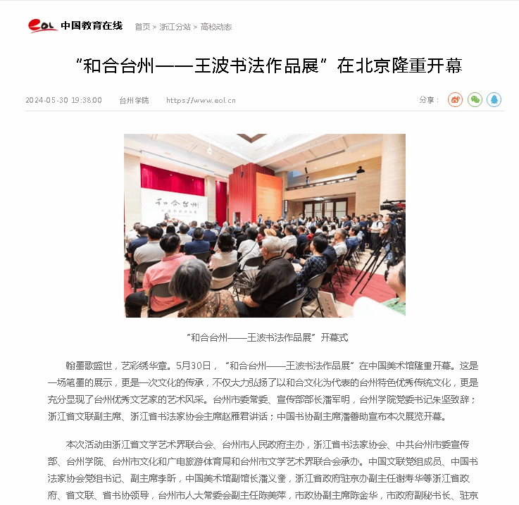 翰墨歌盛世,艺彩绣华章。5月30日,“和合台州——王波书法作品展”在中国美术馆隆重开幕。这是一场笔墨的展示,更是一次文化的传承,不仅大力弘扬了以和合文化为代表的台州特色优秀传统文化,更是充分显现了台州优秀文艺家的艺术风采。台州市委常委、宣传部部长潘军明,台州学院党委书记朱坚致辞;浙江省文联副主席、浙江省书法家协会主席赵雁君讲话;中国书协副主席潘善助宣布本次展览开幕。