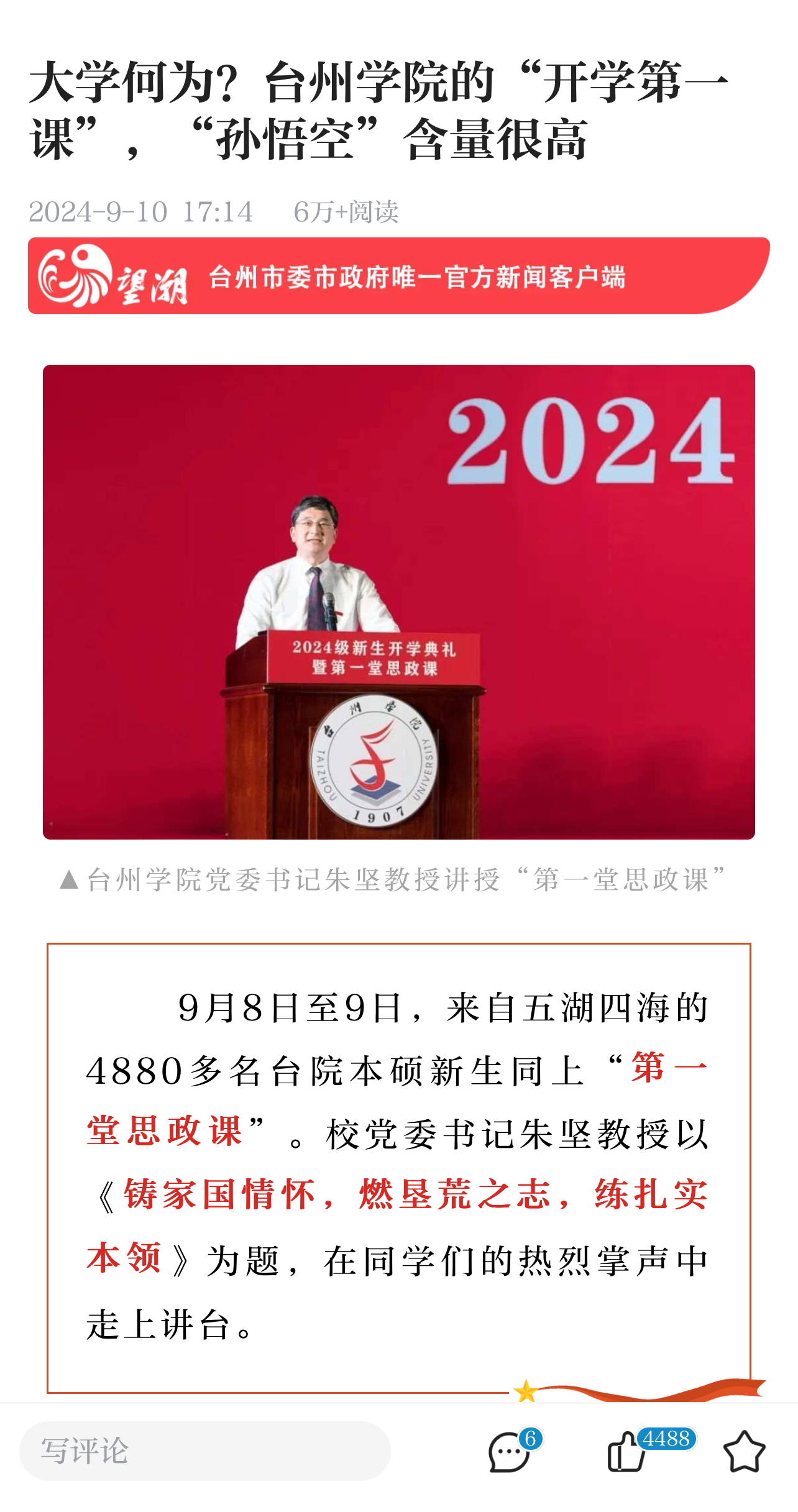 9月8日至9日,来自五湖四海的4880多名台院本硕新生同上“第一堂思政课”。校党委书记朱坚教授以《铸家国情怀,燃垦荒之志,练扎实本领》为题,在同学们的热烈掌声中走上讲台。