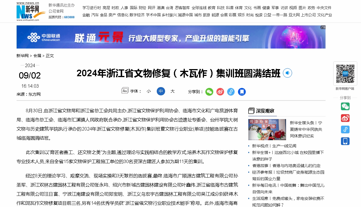 8月30日,由浙江省文物局和浙江省总工会共同主办,浙江省文物保护利用协会、临海市文化和广电旅游体育局、临海市总工会、临海市汇溪镇人民政府联合承办,浙江省文物保护利用协会古迹遗址专委会、台州学院大树文物与历史建筑学院执行承办的2024年浙江省文物修复(木瓦作)集训班暨文物行业职业(单项)技能选拔赛在古城临海圆满结班。
