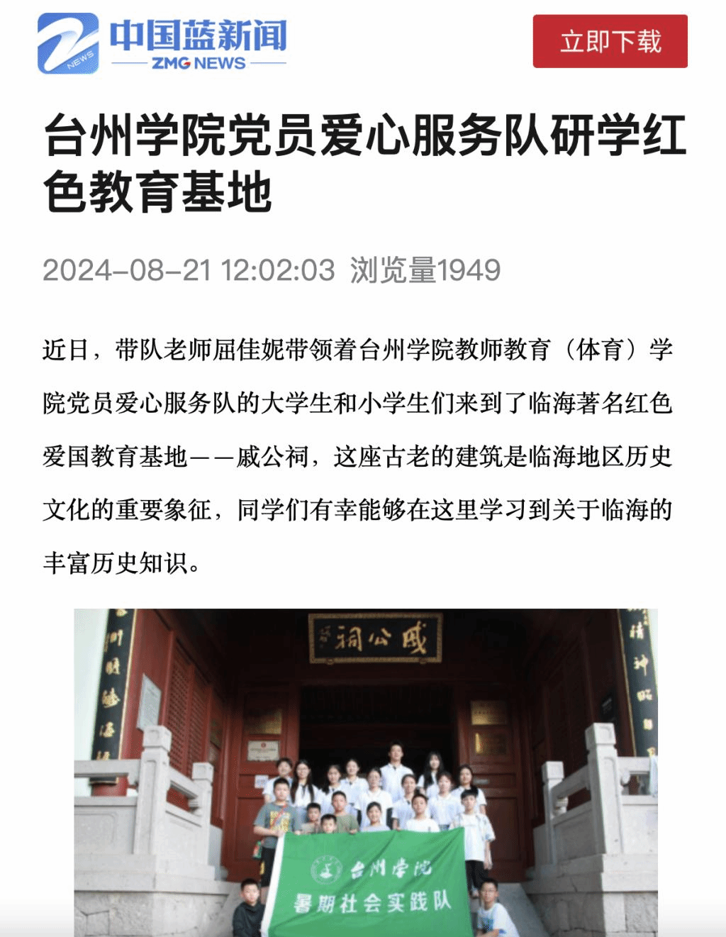 近日,带队老师屈佳妮带领着台州学院教师教育(体育)学院党员爱心服务队的大学生和小学生们来到了临海著名红色爱国教育基地——戚公祠,这座古老的建筑是临海地区历史文化的重要象征,同学们有幸能够在这里学习到关于临海的丰富历史知识。
