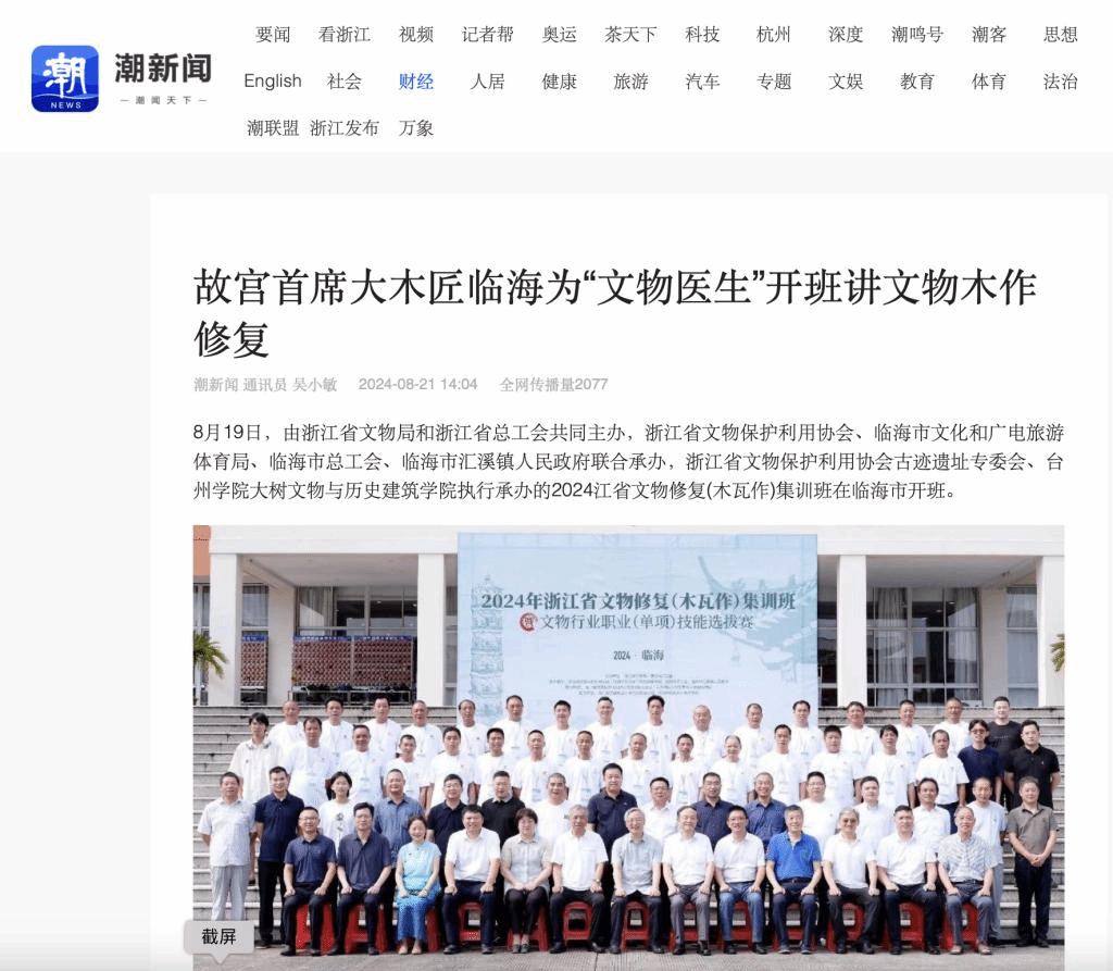 8月19日,由浙江省文物局和浙江省总工会共同主办,浙江省文物保护利用协会、临海市文化和广电旅游体育局、临海市总工会、临海市汇溪镇人民政府联合承办,浙江省文物保护利用协会古迹遗址专委会、台州学院大树文物与历史建筑学院执行承办的2024江省文物修复(木瓦作)集训班在临海市开班。