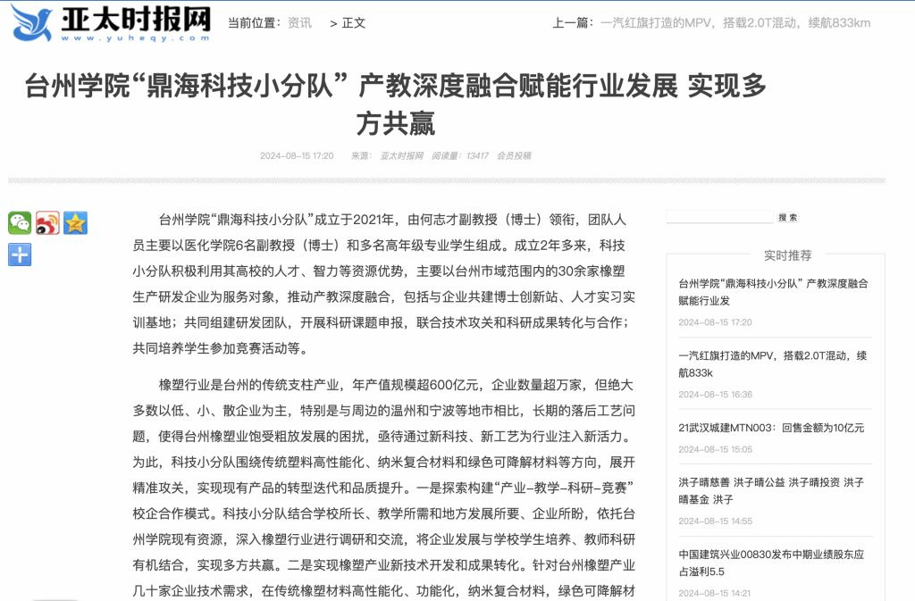 台州学院“鼎海科技小分队”成立于2021年,由何志才副教授(博士)领衔,团队人员主要以医化学院6名副教授(博士)和多名高年级专业学生组成。成立2年多来,科技小分队积极利用其高校的人才、智力等资源优势,主要以台州市域范围内的30余家橡塑生产研发企业为服务对象,推动产教深度融合,包括与企业共建博士创新站、人才实习实训基地;共同组建研发团队,开展科研课题申报,联合技术攻关和科研成果转化与合作;共同培养学生参加竞赛活动等。