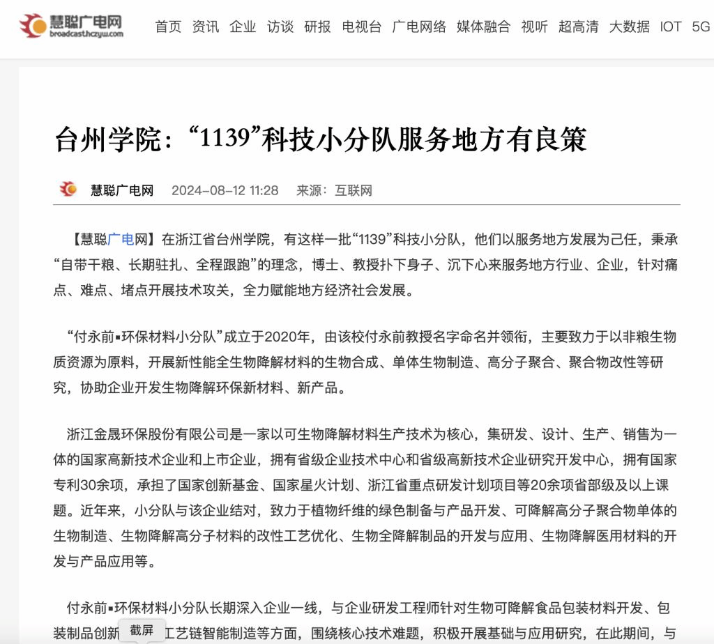 浙江金晟环保股份有限公司是一家以可生物降解材料生产技术为核心,集研发、设计、生产、销售为一体的国家高新技术企业和上市企业,拥有省级企业技术中心和省级高新技术企业研究开发中心,拥有国家专利30余项,承担了国家创新基金、国家星火计划、浙江省重点研发计划项目等20余项省部级及以上课题。近年来,小分队与该企业结对,致力于植物纤维的绿色制备与产品开发、可降解高分子聚合物单体的生物制造、生物降解高分子材料的改性工艺优化、生物全降解制品的开发与应用、生物降解医用材料的开发与产品应用等。
