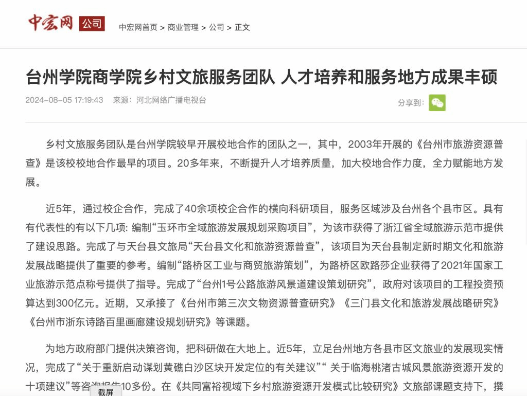 为地方政府部门提供决策咨询,把科研做在大地上。近5年,立足台州地方各县市区文旅业的发展现实情况,完成了“关于重新启动谋划黄礁白沙区块开发定位的有关建议”“ 关于临海桃渚古城风景旅游资源开发的十项建议”等咨询报告10多份。在《共同富裕视域下乡村旅游资源开发模式比较研究》文旅部课题支持下,撰写了《从“干江样本”到“干江模式”:玉环市创新股权众筹模式推进乡村旅游共同富裕的主要成效与经验启示》咨询报告。《浙江社科要报》2022年第21期《关于打造“和合文化世界级旅游景区”的若干建议》,提出了明确发展目标,分三阶段建成旅游协作区、旅游联合体、旅游一体化,实施差异化发展战略的思路。