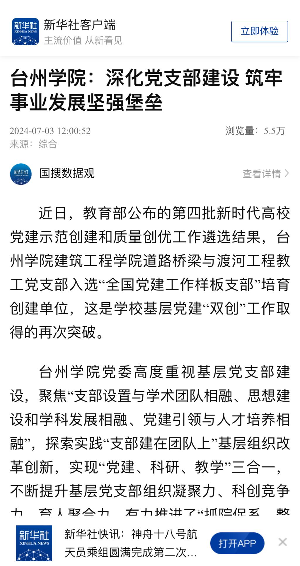 近日,教育部公布的第四批新时代高校党建示范创建和质量创优工作遴选结果,台州学院建筑工程学院道路桥梁与渡河工程教工党支部入选“全国党建工作样板支部”培育创建单位,这是学校基层党建“双创”工作取得的再次突破。