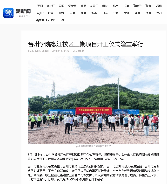 杨玲玲在讲话中表示,台州学院椒江校区三期项目盛大开工既是推进全市高等教育基建高质量发展的一件大事,也是提升台州学院办学条件、增强师生福祉的一件喜事。希望项目业主单位和施工建设单位争时抢速抓进度,按时按点、高质高效完成各节点建设任务;市、区两级政府有关部门高效对接、强化协作,及时解决项目建设过程中遇到的问题;台州学院紧紧围绕“升大、申博、创一流”的目标,以三期项目建设带动发展大跃升,加快建成台州大学,为推动台州高等教育高质量发展贡献更大力量。