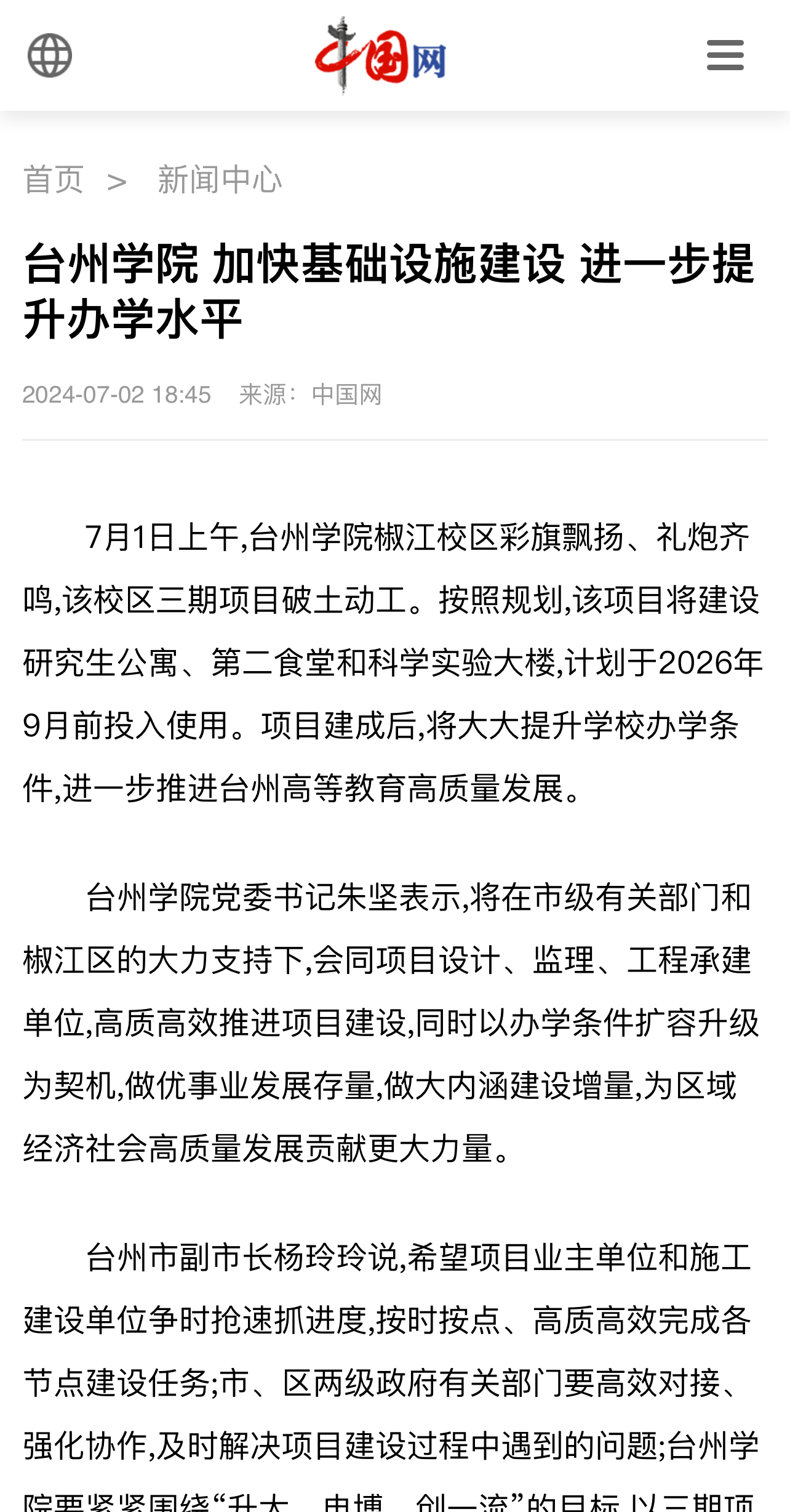 7月1日上午,台州学院椒江校区彩旗飘扬、礼炮齐鸣,该校区三期项目破土动工。按照规划,该项目将建设研究生公寓、第二食堂和科学实验大楼,计划于2026年9月前投入使用。项目建成后,将大大提升学校办学条件,进一步推进台州高等教育高质量发展。