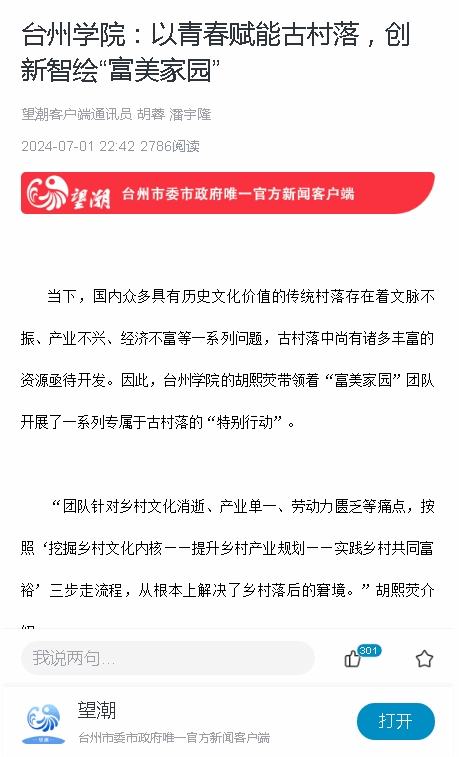 据介绍,“富美家园”团队在台州学院人文学院的支持下,依托浙江省乡村文化保护传播中心,长期对接合作古村,根据实地调研的资料精准申报,在申报成功并获得政府资金支持后,依托村落本地特色文化,对古村进行开发保护和文旅规划。通过长期的社会实践经验积累和专家教授的多次指导,团队逐步形成了一整套缜密的传统村落申报流程和独到的文化传承方案。目前团队已经成功帮助天台县上联新村等村落申报国家级古村落,成功解决了传统村落申报难、发展慢等困境。