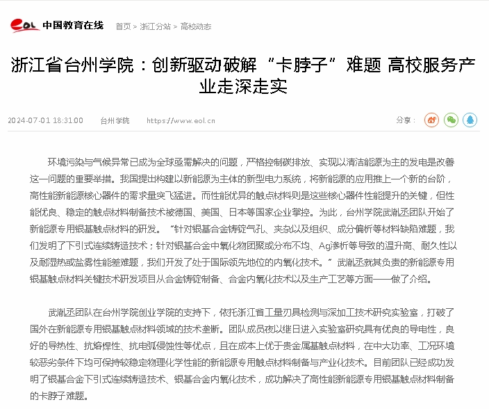 武胤丞团队在台州学院创业学院的支持下,依托浙江省工量刃具检测与深加工技术研究实验室,打破了国外在新能源专用银基触点材料领域的技术垄断。团队成员夜以继日进入实验室研究具有优良的导电性,良好的导热性、抗熔焊性、抗电弧侵蚀性等优点,且在成本上优于贵金属基触点材料,在中大功率、工况环境较恶劣条件下均可保持较稳定物理化学性能的新能源专用触点材料制备与产业化技术。目前团队已经成功发明了银基合金下引式连续铸造技术、银基合金内氧化技术,成功解决了高性能新能源专用银基触点材料制备的卡脖子难题。