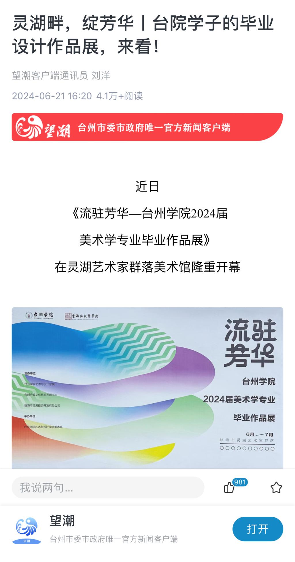近日,《流驻芳华—台州学院2024届美术学专业毕业作品展》在灵湖艺术家群落美术馆隆重开幕。