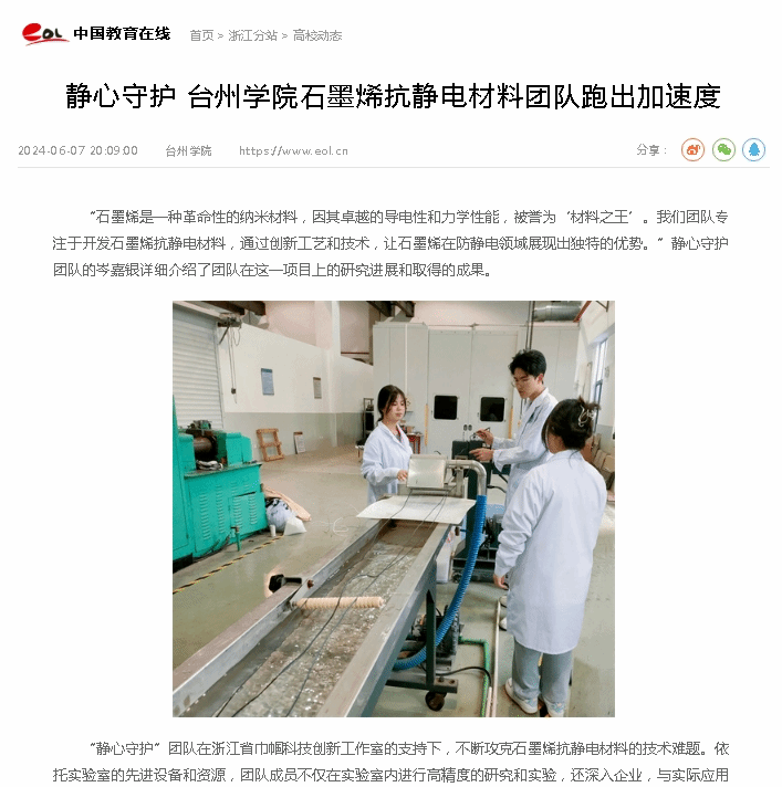 “静心守护”团队在浙江省巾帼科技创新工作室的支持下,不断攻克石墨烯抗静电材料的技术难题。依托实验室的先进设备和资源,团队成员不仅在实验室内进行高精度的研究和实验,还深入企业,与实际应用需求紧密结合,优化产品性能。目前,团队已成功研发出高效抗静电的石墨烯复合材料,并在多个领域展开应用测试。