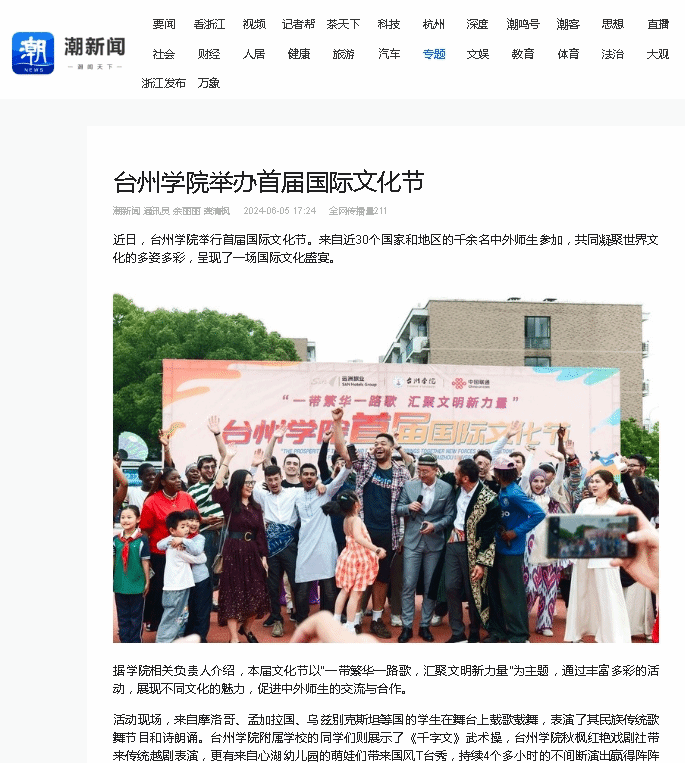 近日,台州学院举行首届国际文化节。来自近30个国家和地区的千余名中外师生参加,共同凝聚世界文化的多姿多彩,呈现了一场国际文化盛宴。