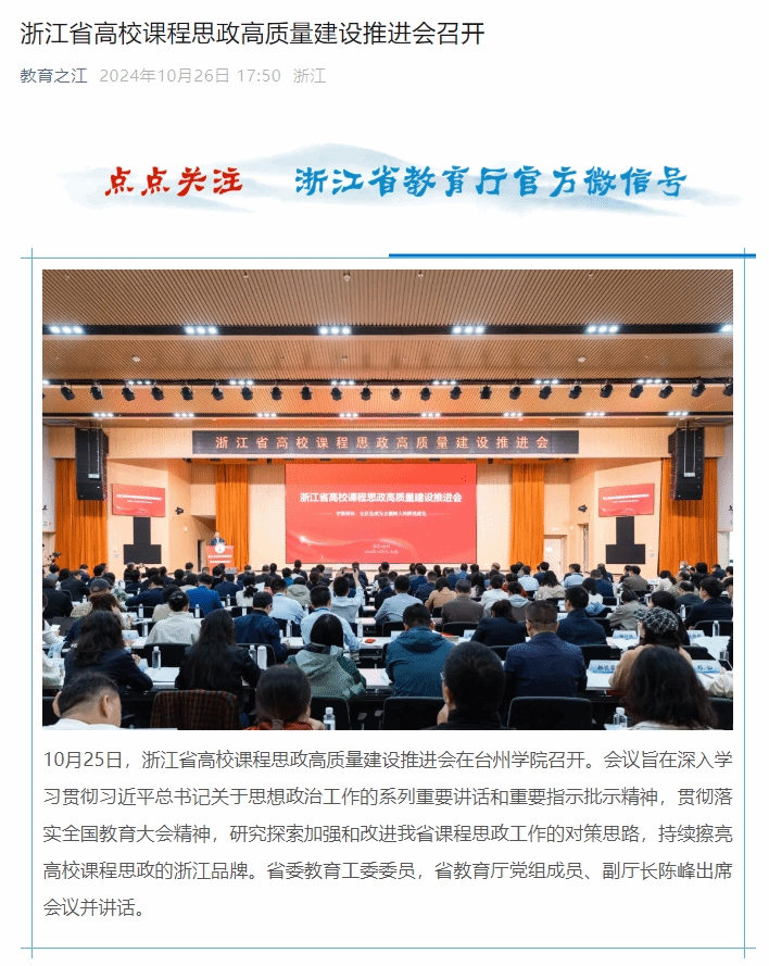 10月25日,浙江省高校课程思政高质量建设推进会在台州学院召开。会议旨在深入学习贯彻习近平总书记关于思想政治工作的系列重要讲话和重要指示批示精神,贯彻落实全国教育大会精神,研究探索加强和改进我省课程思政工作的对策思路,持续擦亮高校课程思政的浙江品牌。省委教育工委委员,省教育厅党组成员、副厅长陈峰出席会议并讲话。