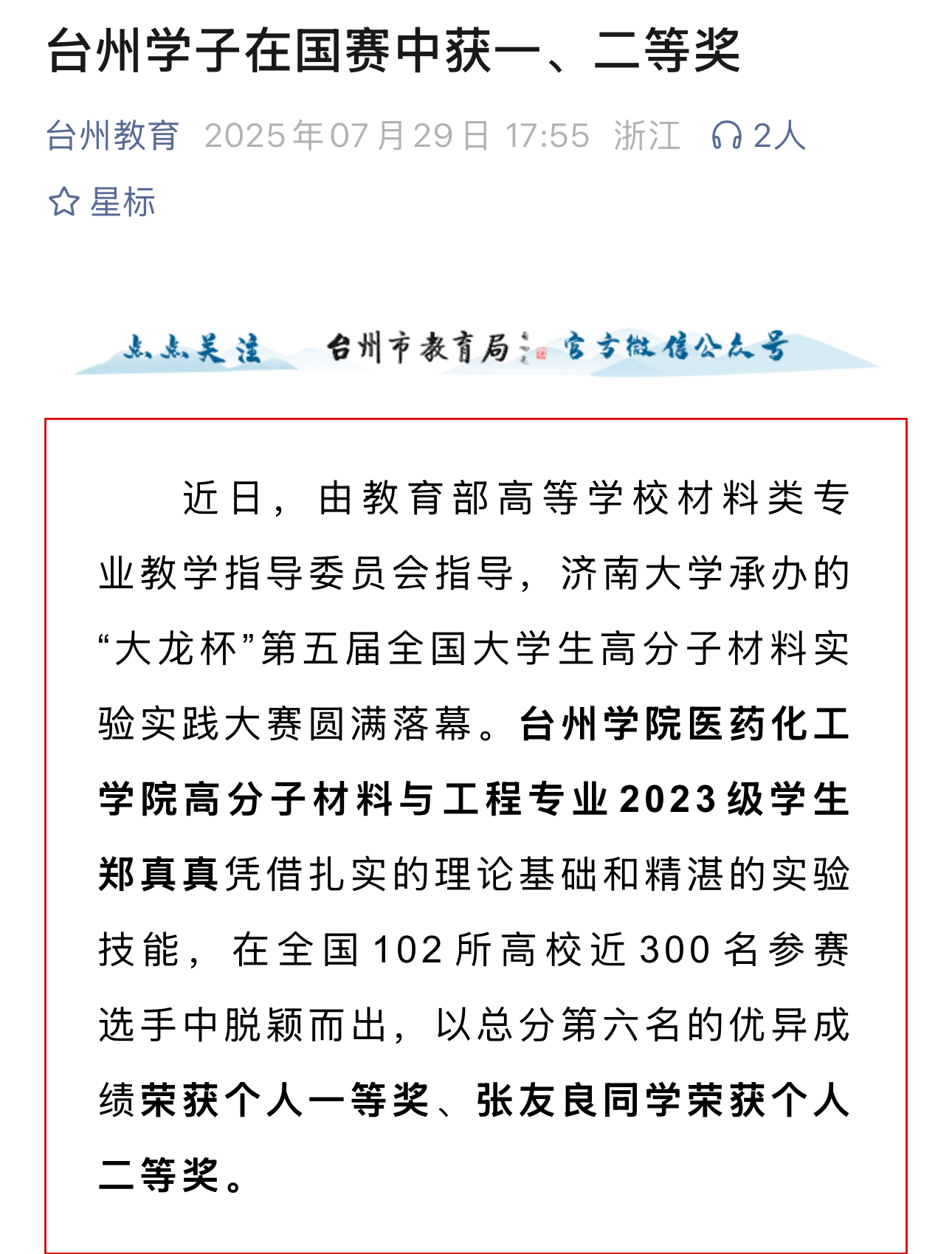 近日,由教育部高等学校材料类专业教学指导委员会指导,济南大学承办的“大龙杯”第五届全国大学生高分子材料实验实践大赛圆满落幕。台州学院医药化工学院高分子材料与工程专业2023级学生郑真真凭借扎实的理论基础和精湛的实验技能,在全国102所高校近300名参赛选手中脱颖而出,以总分第六名的优异成绩荣获个人一等奖、张友良同学荣获个人二等奖。