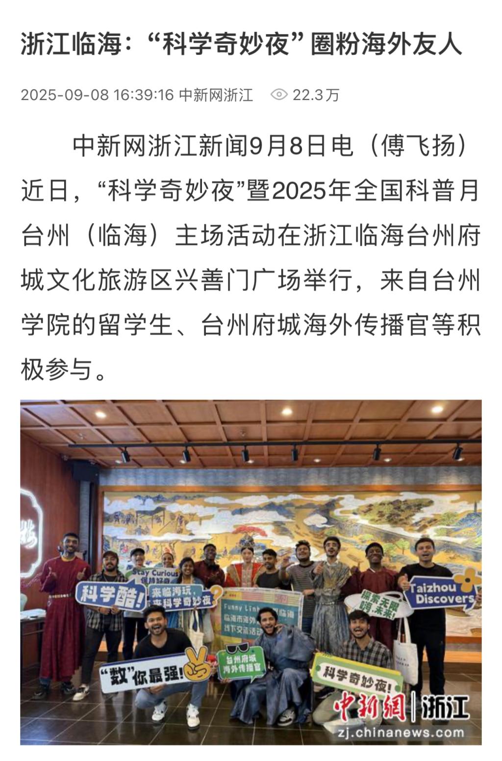 中新网浙江新闻9月8日电(傅飞扬)近日,“科学奇妙夜”暨2025年全国科普月台州(临海)主场活动在浙江临海台州府城文化旅游区兴善门广场举行,来自台州学院的留学生、台州府城海外传播官等积极参与。