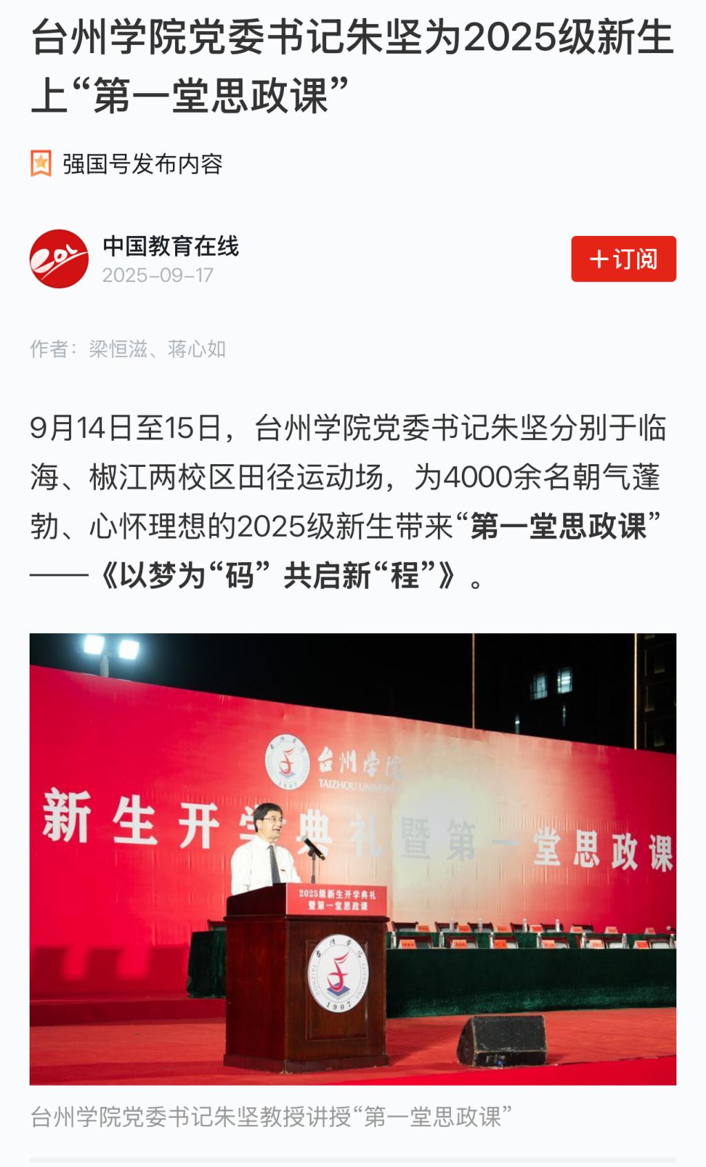 9月14日至15日,台州学院党委书记朱坚分别于临海、椒江两校区田径运动场,为4000余名朝气蓬勃、心怀理想的2025级新生带来“第一堂思政课”——《以梦为“码” 共启新“程”》。