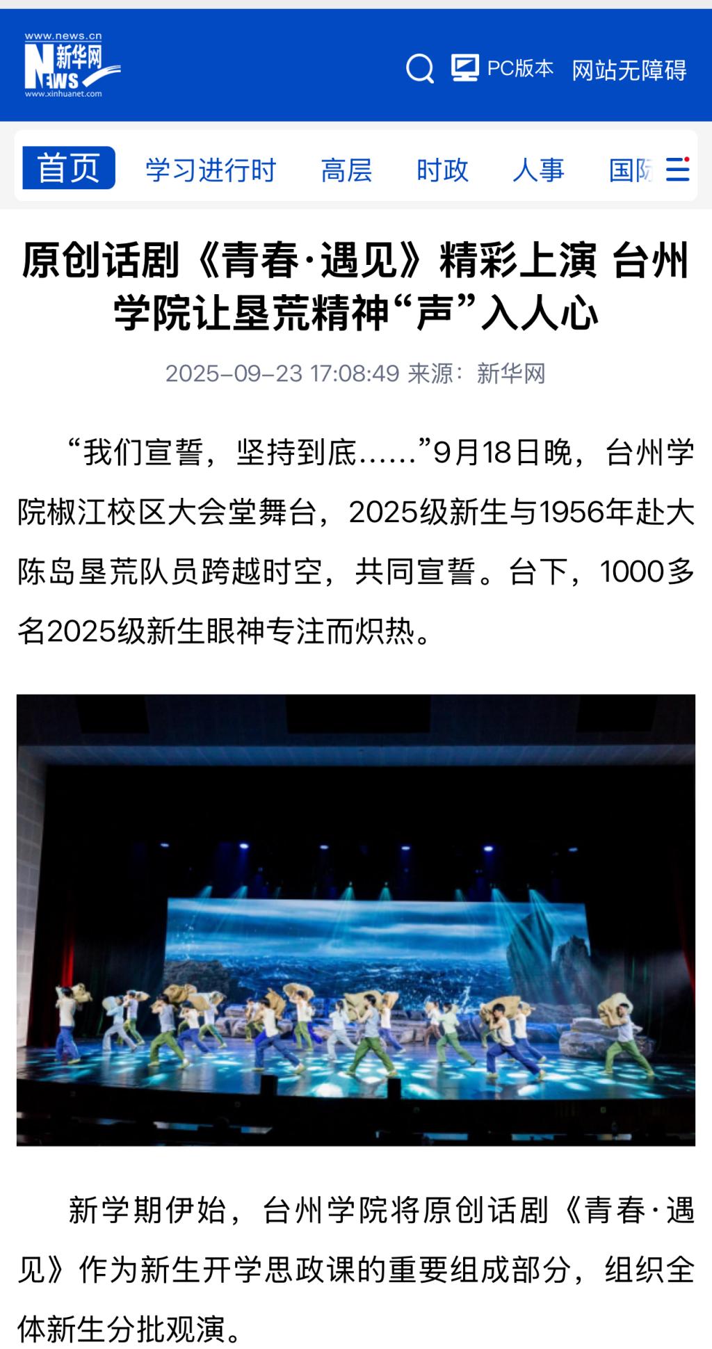 新学期伊始,台州学院将原创话剧《青春·遇见》作为新生开学思政课的重要组成部分,组织全体新生分批观演。
