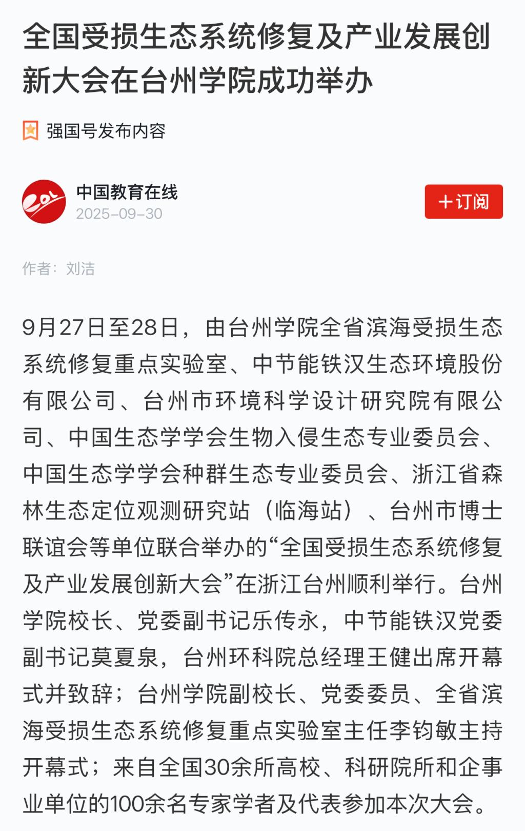 9月27日至28日,由台州学院全省滨海受损生态系统修复重点实验室、中节能铁汉生态环境股份有限公司、台州市环境科学设计研究院有限公司、中国生态学学会生物入侵生态专业委员会、中国生态学学会种群生态专业委员会、浙江省森林生态定位观测研究站(临海站)、台州市博士联谊会等单位联合举办的“全国受损生态系统修复及产业发展创新大会”在浙江台州顺利举行。台州学院校长、党委副书记乐传永,中节能铁汉党委副书记莫夏泉,台州环科院总经理王健出席开幕式并致辞;台州学院副校长、党委委员、全省滨海受损生态系统修复重点实验室主任李钧敏主持开幕式;来自全国30余所高校、科研院所和企事业单位的100余名专家学者及代表参加本次大会。
