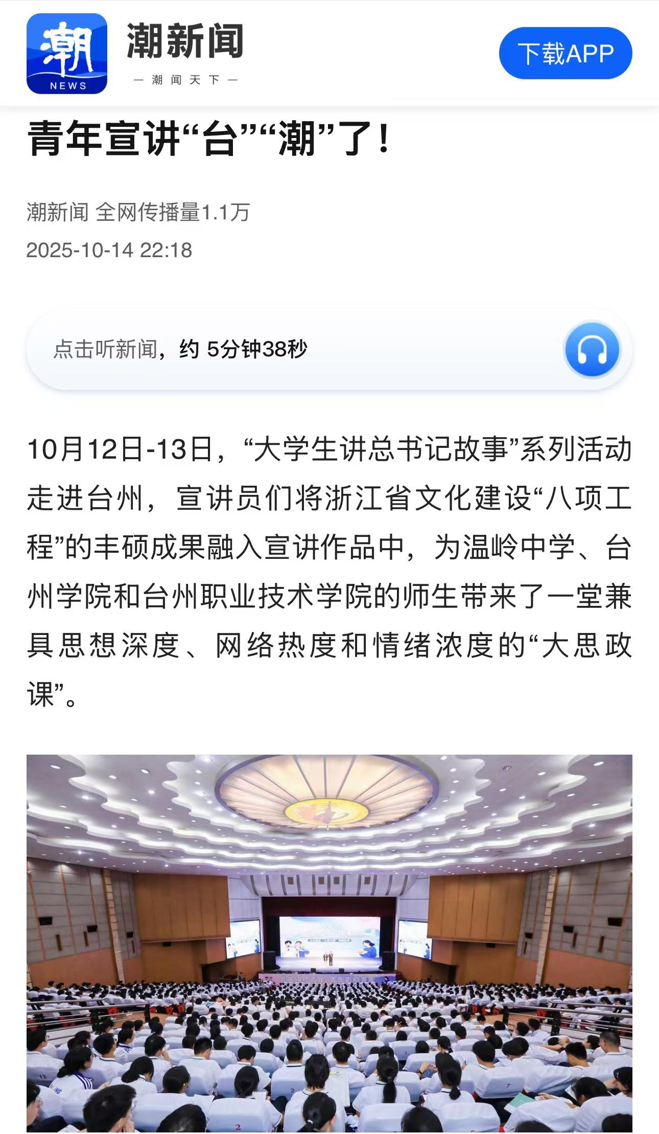 10月12日-13日,“大学生讲总书记故事”系列活动走进台州,宣讲员们将浙江省文化建设“八项工程”的丰硕成果融入宣讲作品中,为温岭中学、台州学院和台州职业技术学院的师生带来了一堂兼具思想深度、网络热度和情绪浓度的“大思政课”。