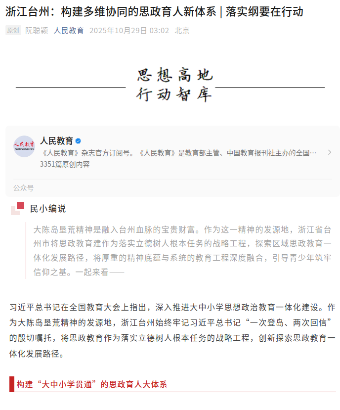 习近平总书记在全国教育大会上指出,深入推进大中小学思想政治教育一体化建设。作为大陈岛垦荒精神的发源地,浙江台州始终牢记习近平总书记“一次登岛、两次回信”的殷切嘱托,将思政教育作为落实立德树人根本任务的战略工程,创新探索思政教育一体化发展路径。