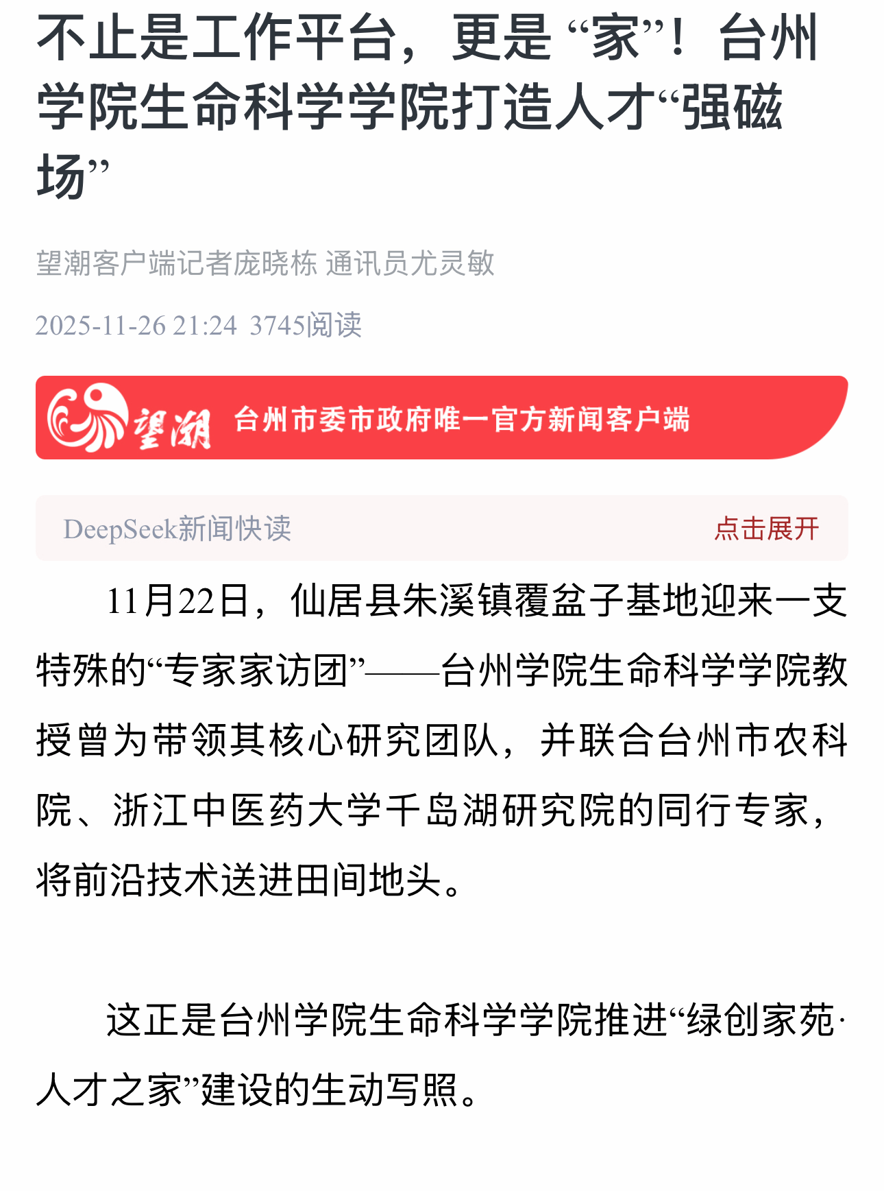 “人才是学院发展的核心驱动力。”生命科学学院院长赵凯表示,自2023年底“绿创家苑”人才之家建成以来,学院始终坚守初心:不仅为人才提供卓越工作平台,更打造兼具归属感、成就感与幸福感的“家”,一个真正实现产才融合与生态涵养的综合服务平台。通过党建联建机制,学院积极推动校企地深度融合,将“家”建在产业一线,为人才提供落地支撑与发展空间,助力其主动融入地方发展大局。