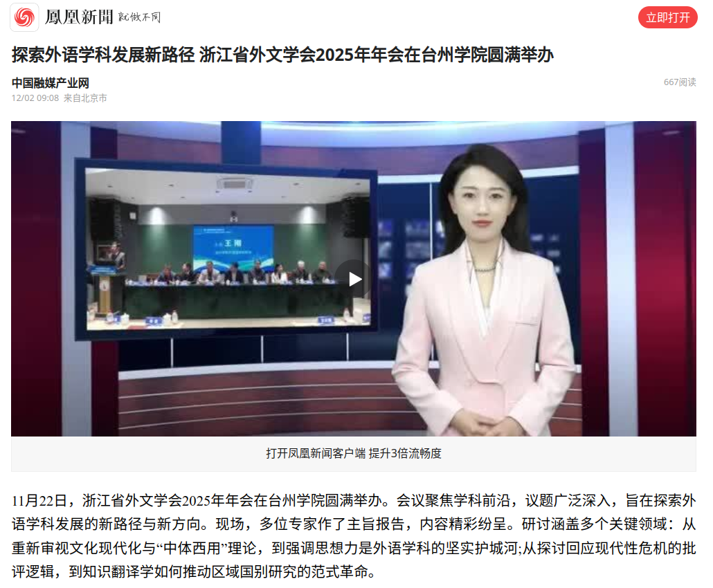 11月22日,浙江省外文学会2025年年会在台州学院圆满举办。会议聚焦学科前沿,议题广泛深入,旨在探索外语学科发展的新路径与新方向。现场,多位专家作了主旨报告,内容精彩纷呈。研讨涵盖多个关键领域:从重新审视文化现代化与“中体西用”理论,到强调思想力是外语学科的坚实护城河;从探讨回应现代性危机的批评逻辑,到知识翻译学如何推动区域国别研究的范式革命。
