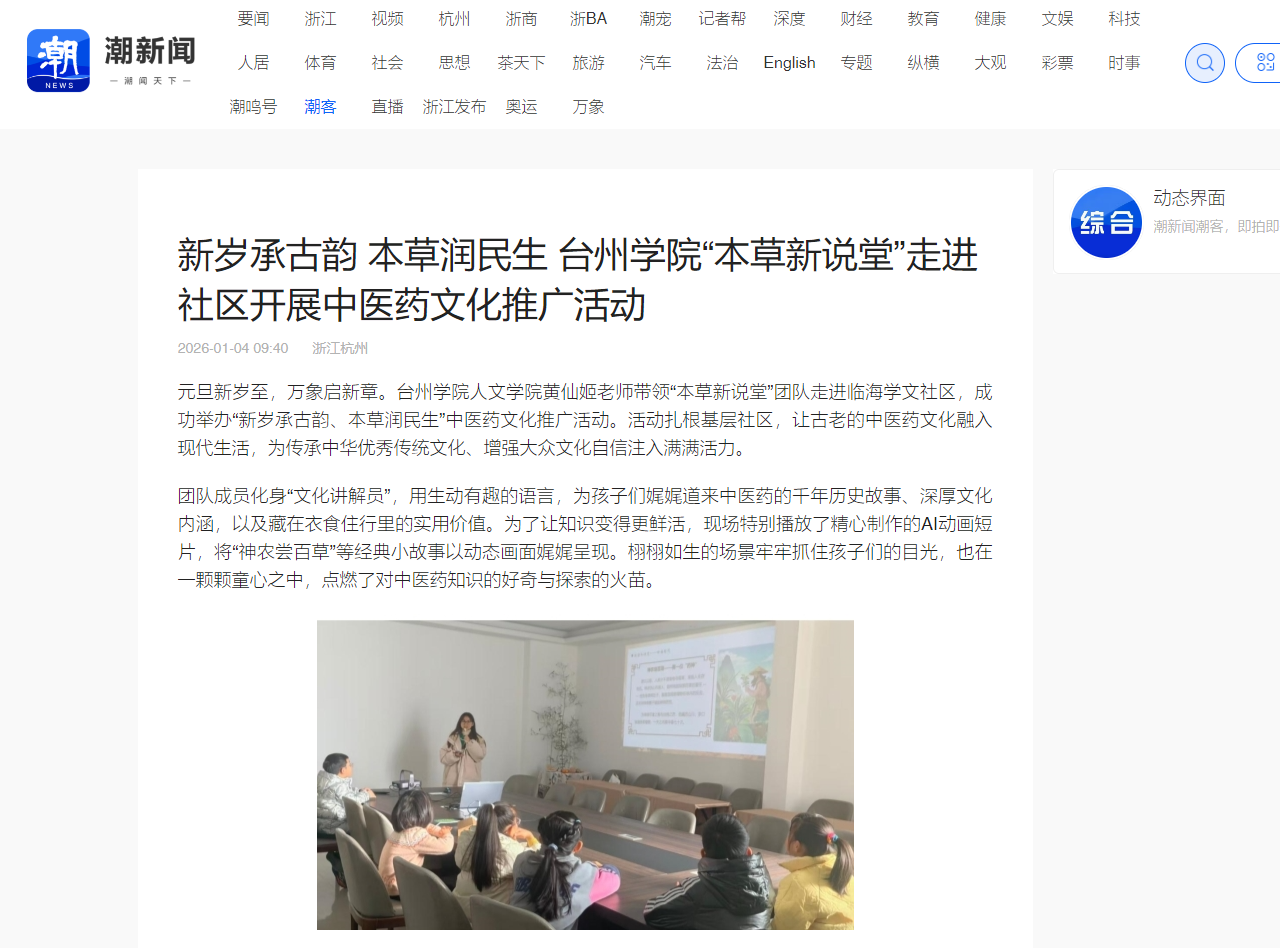 元旦新岁至,万象启新章。台州学院人文学院黄仙姬老师带领“本草新说堂”团队走进临海学文社区,成功举办“新岁承古韵、本草润民生”中医药文化推广活动。活动扎根基层社区,让古老的中医药文化融入现代生活,为传承中华优秀传统文化、增强大众文化自信注入满满活力。