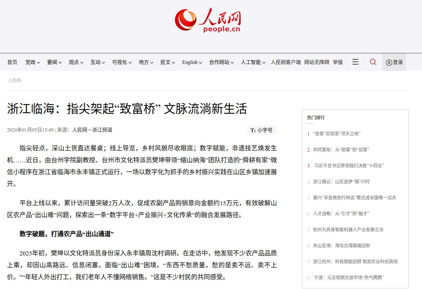 指尖轻点,深山土货直达餐桌;线上导览,乡村风貌尽收眼底;数字赋能,非遗技艺焕发生机……近日,由台州学院副教授、台州市文化特派员樊坤带领“缩山纳海”团队打造的“舜耕有家”微信小程序在浙江省临海市永丰镇正式运行,一场以数字化为抓手的乡村振兴实践在山区乡镇加速展开。