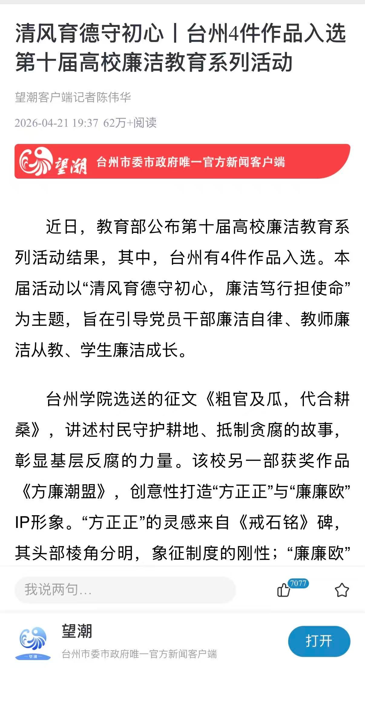 近日,教育部公布第十届高校廉洁教育系列活动结果,其中,台州有4件作品入选。本届活动以“清风育德守初心,廉洁笃行担使命”为主题,旨在引导党员干部廉洁自律、教师廉洁从教、学生廉洁成长。