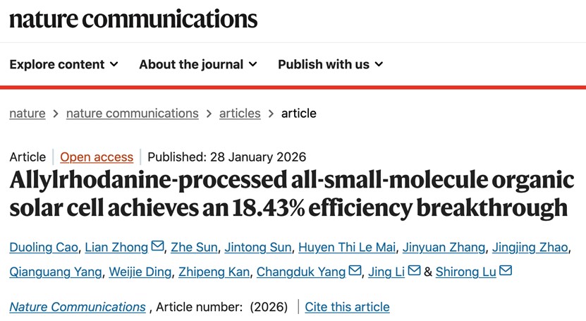 材料学院陆仕荣团队《Nature Communications》发文,刷新全小分子电池国际效率纪录