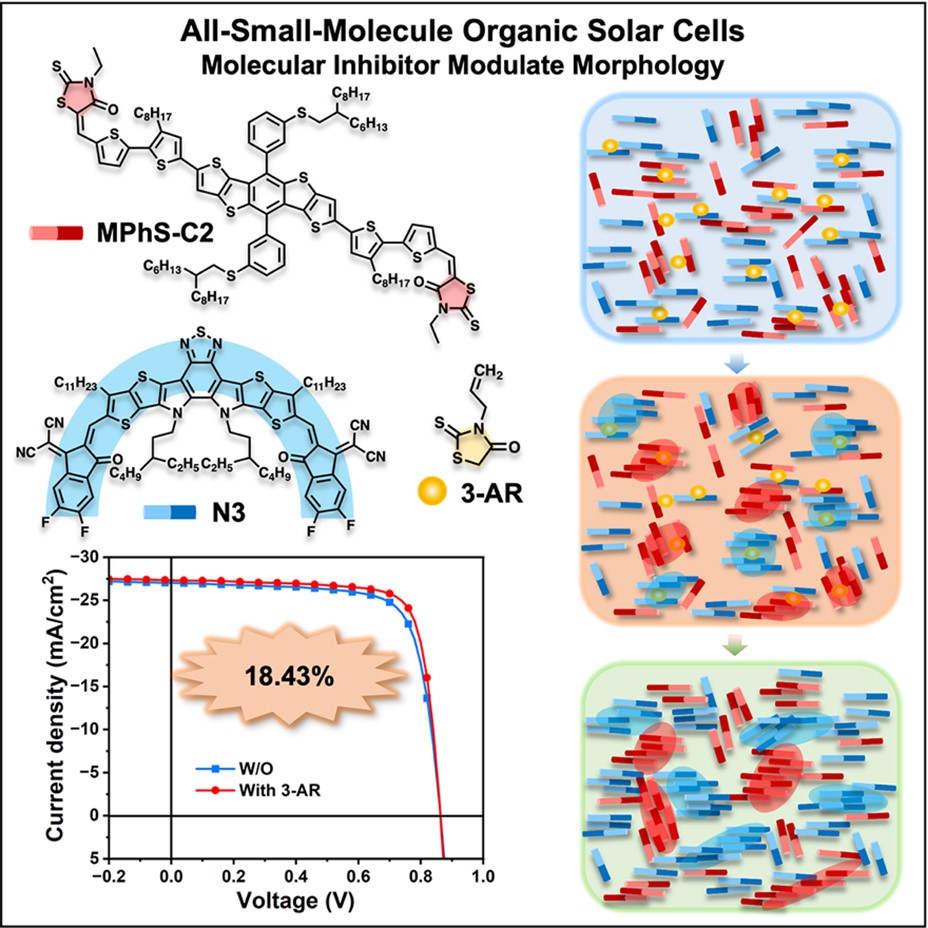 全小分子有机太阳能电池因材料分子结构明确以及批次稳定性好,展现出巨大产业化潜力,但其强结晶性导致的过度相分离问题长期制约性能提升。本工作创新性地采用结构类似于给体MPhS-C2末端基团的挥发性固体添加剂3-丙烯基罗丹宁(3-AR),实现了对活性层形貌的精准调控。理论计算与形貌表征共同揭示,3-AR通过热力学上倾向于与受体N3的选择性相互作用,在动力学过程中有效抑制给受体的过度结晶与聚集,引导形成纳米尺度理想的双连续互穿网络结构,并显著提高垂直方向的均匀性。优化的形貌协同促进电荷的高效解离与传输,抑制双分子与陷阱辅助复合,最终使器件获得了18.43%的光电转换效率(第三方认证18.16%),创下了二元全小分子电池最高效率纪录。此项成果在刷新国际效率纪录的同时,更进一步推动了有机太阳能电池的商业化进程。