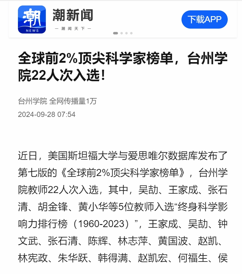全球前2%顶尖科学家榜单,台州学院22人次入选!