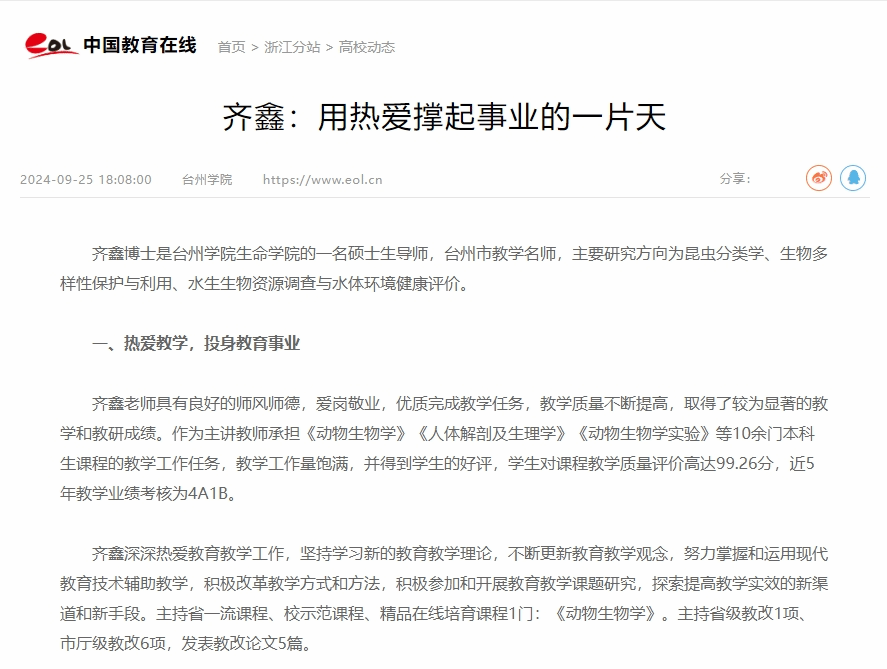 齐鑫博士是台州学院生命学院的一名硕士生导师,台州市教学名师,主要研究方向为昆虫分类学、生物多样性保护与利用、水生生物资源调查与水体环境健康评价。