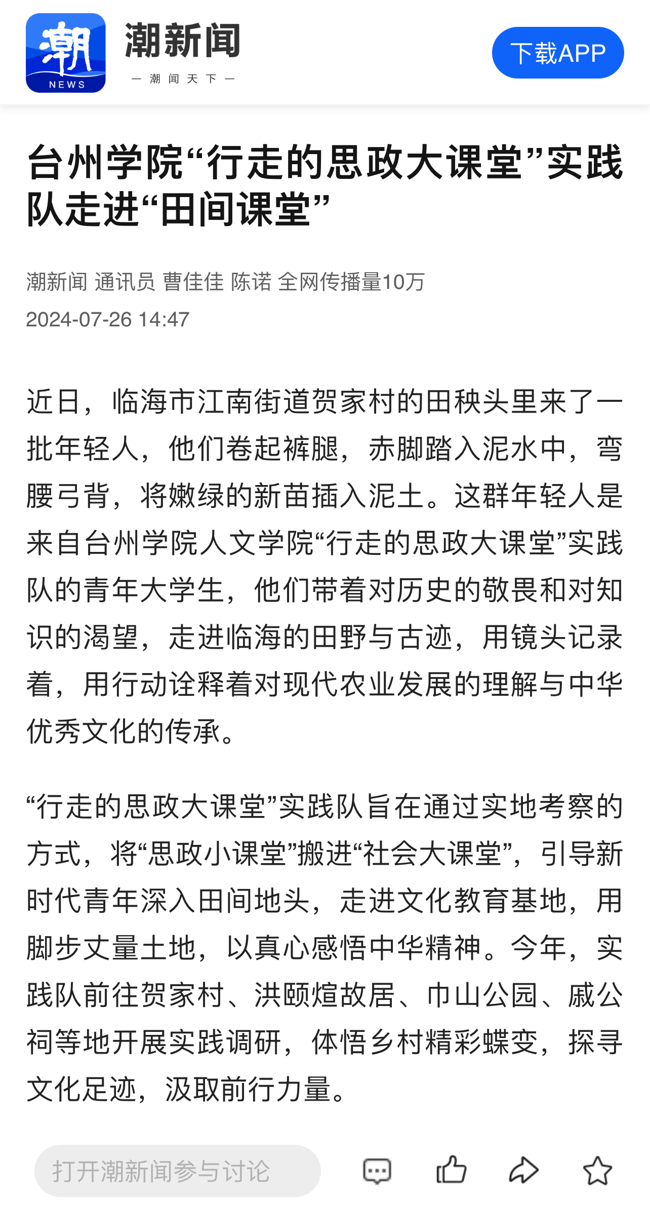 近日,临海市江南街道贺家村的田秧头里来了一批年轻人,他们卷起裤腿,赤脚踏入泥水中,弯腰弓背,将嫩绿的新苗插入泥土。这群年轻人是来自台州学院人文学院“行走的思政大课堂”实践队的青年大学生,他们带着对历史的敬畏和对知识的渴望,走进临海的田野与古迹,用镜头记录着,用行动诠释着对现代农业发展的理解与中华优秀文化的传承。