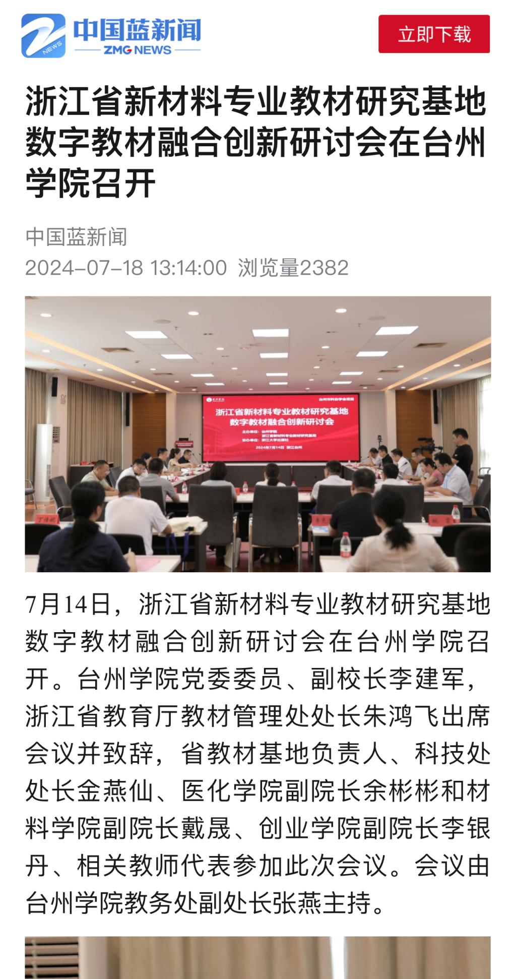 7月14日,浙江省新材料专业教材研究基地数字教材融合创新研讨会在台州学院召开。台州学院党委委员、副校长李建军,浙江省教育厅教材管理处处长朱鸿飞出席会议并致辞,省教材基地负责人、科技处处长金燕仙、医化学院副院长余彬彬和材料学院副院长戴晟、创业学院副院长李银丹、相关教师代表参加此次会议。会议由台州学院教务处副处长张燕主持。