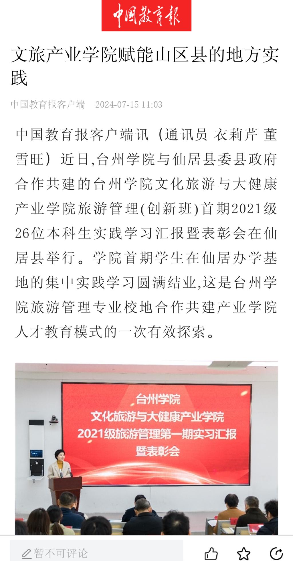 近日,台州学院与仙居县委县政府合作共建的台州学院文化旅游与大健康产业学院旅游管理(创新班)首期2021级26位本科生实践学习汇报暨表彰会在仙居县举行。学院首期学生在仙居办学基地的集中实践学习圆满结业,这是台州学院旅游管理专业校地合作共建产业学院人才教育模式的一次有效探索。