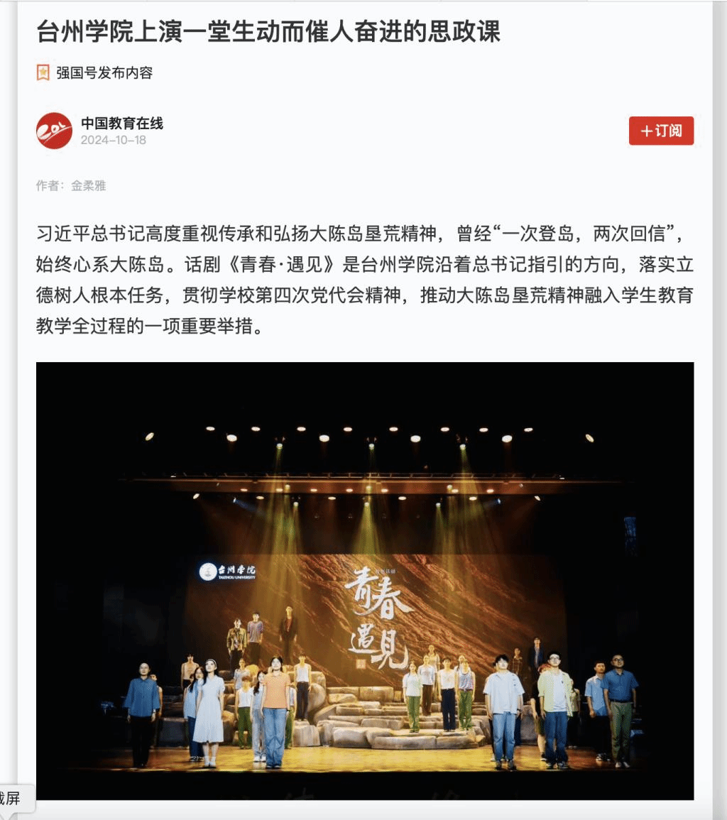 “一场话剧就是一堂生动的思政课”,台州学院党委书记朱坚表示,学校将观看话剧作为新生始业教育的重要部分,通过戏剧艺术的方式进行思政教育,以文化人、以文育人,带领同学们了解大陈岛的垦荒历史,感悟大陈岛垦荒精神,为学生成长成才注入正能量。接下来,学校将采用线上线下相结合的形式,把《青春·遇见》打造成学校大力传承弘扬大陈岛垦荒精神,培养青年学生“垦荒之志”的鲜活档案。