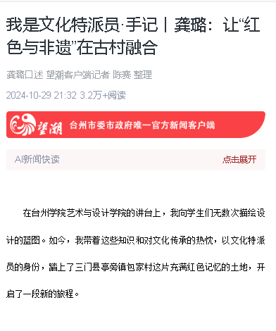 在台州学院艺术与设计学院的讲台上,我向学生们无数次描绘设计的蓝图。如今,我带着这些知识和对文化传承的热忱,以文化特派员的身份,踏上了三门县亭旁镇包家村这片充满红色记忆的土地,开启了一段新的旅程。