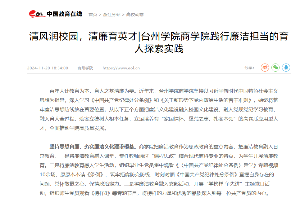 百年大计教育为本,育人之基清廉为要。近年来,台州学院商学院坚持以习近平新时代中国特色社会主义思想为指导,深入学习《中国共产党纪律处分条例》和《关于新形势下党内政治生活的若干准则》,始终将筑牢廉洁思想防线放在首要位置,从以下五个方面把廉洁文化建设融入校园文化建设、融入党规党纪学习教育、融入育人全过程,落实立德树人根本任务,立足培养有“家国情怀、垦荒之志、扎实本领”的高素质应用型人才,全面推动学院高质量发展。