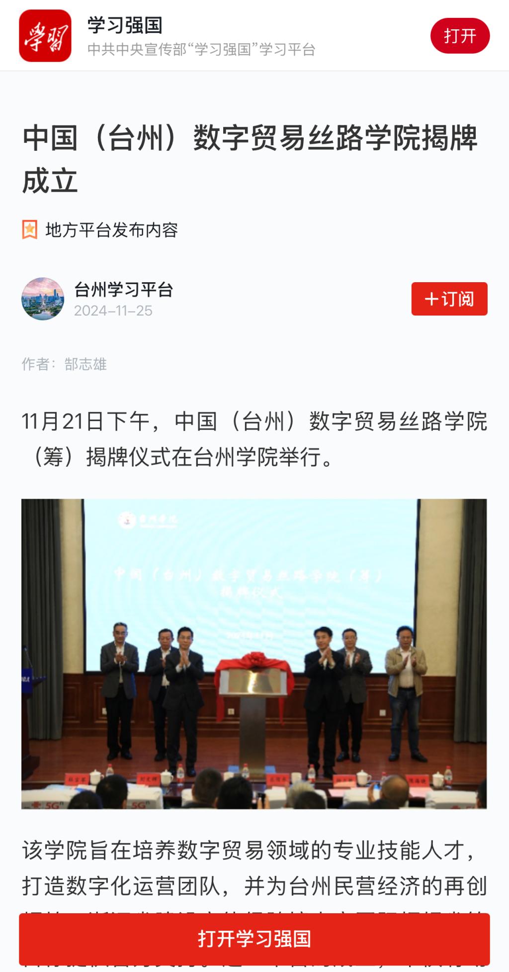 中国(台州)数字贸易丝路学院揭牌成立