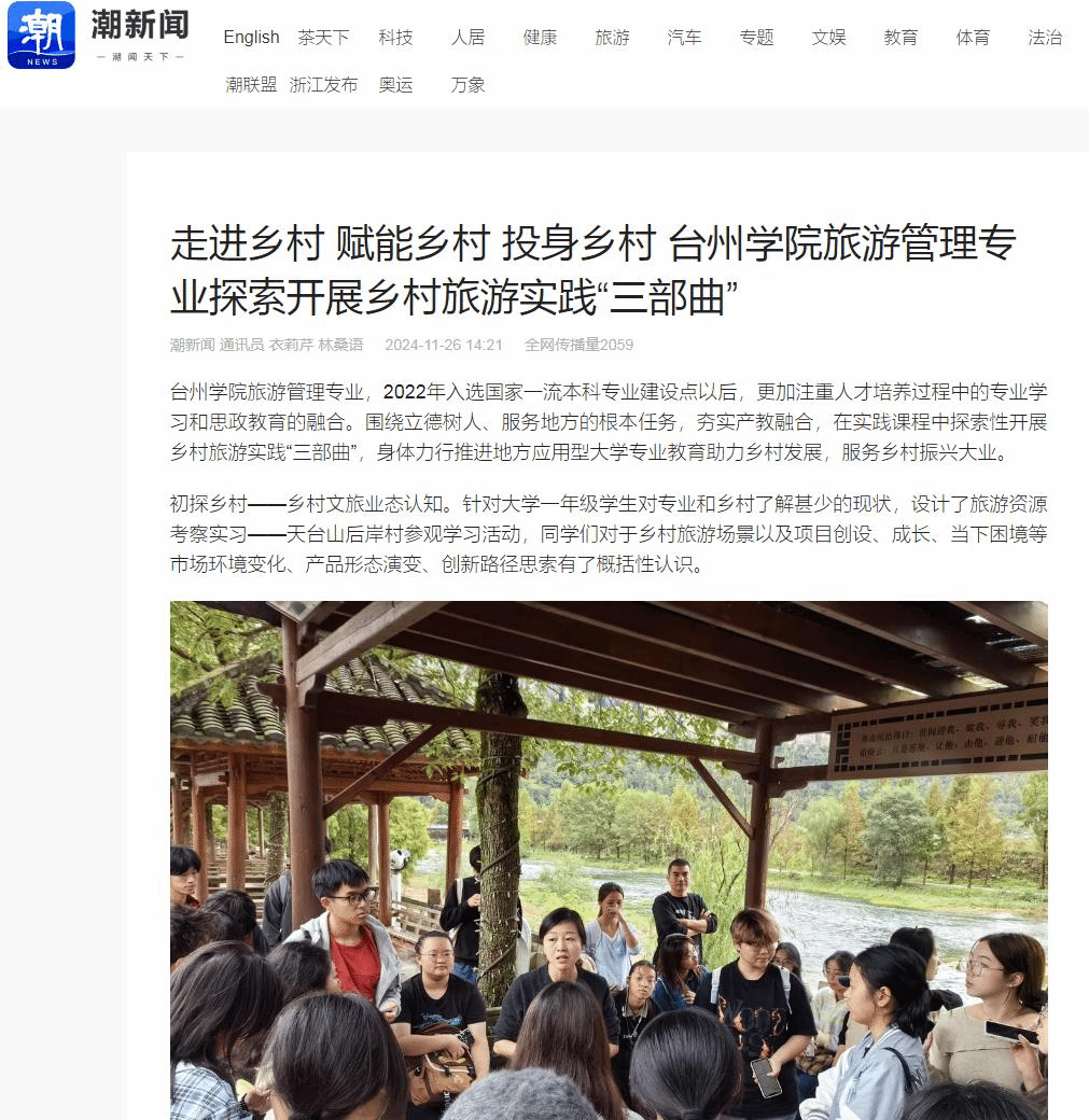 台州学院旅游管理专业,2022年入选国家一流本科专业建设点以后,更加注重人才培养过程中的专业学习和思政教育的融合。围绕立德树人、服务地方的根本任务,夯实产教融合,在实践课程中探索性开展乡村旅游实践“三部曲”,身体力行推进地方应用型大学专业教育助力乡村发展,服务乡村振兴大业。